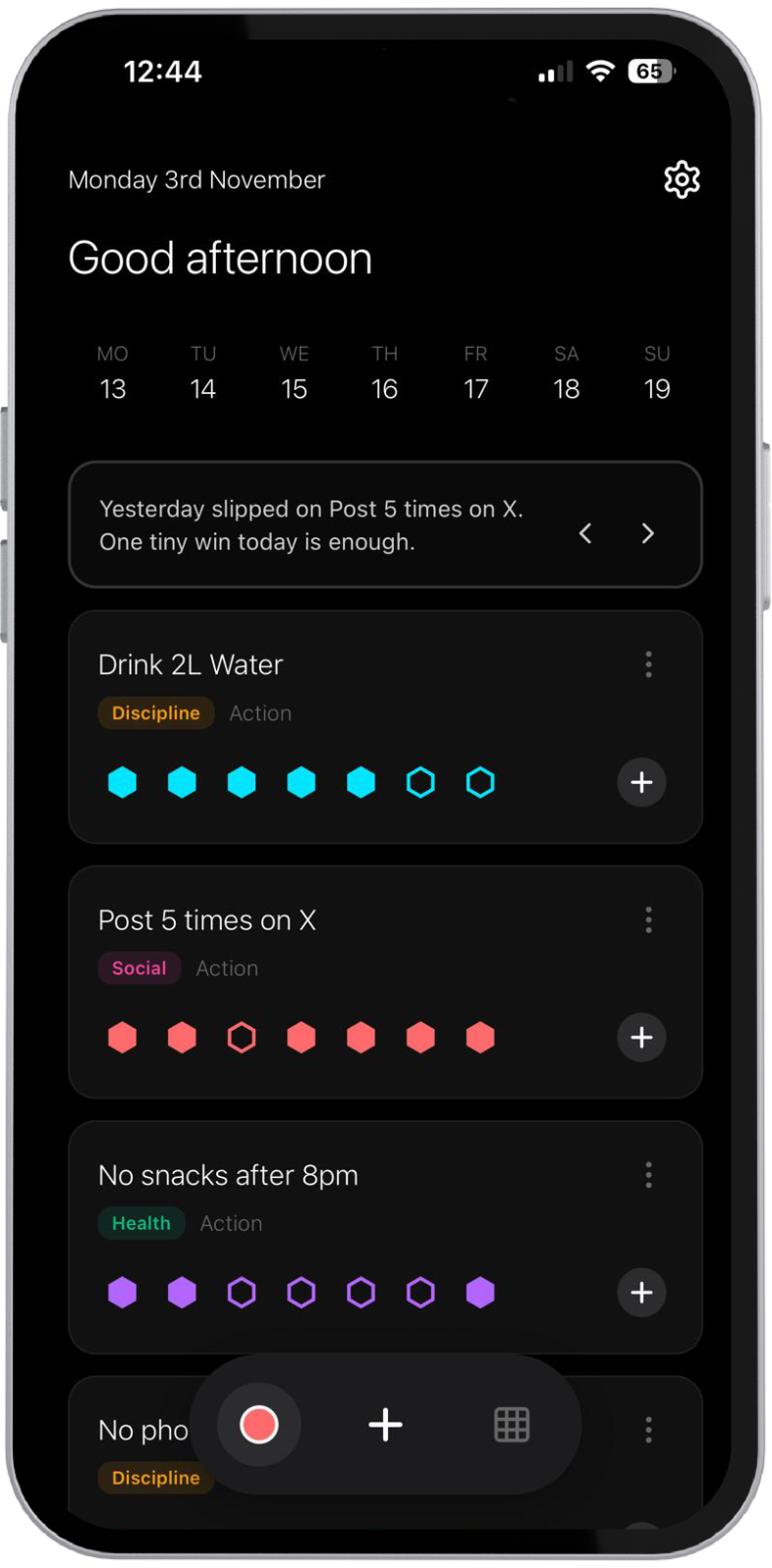 HEXIT turns daily habits into simple hexagons you tap once a day. Each tap fills a tile, and over time you literally see your consistency stacking up. No complicated setup, no endless forms, no noise. Just small actions done daily that compound into big change. HEXIT also shows which personal traits are improving most, like Health, Focus, Confidence and Wellness — so you can clearly see the real identity you’re building day by day. Your data stays 100% private on your device, and you can even plug in your own AI key to receive personalised, motivational nudges tailored to your goals. HEXIT is the cleanest, clearest way to stay committed to the life you’re trying to build.